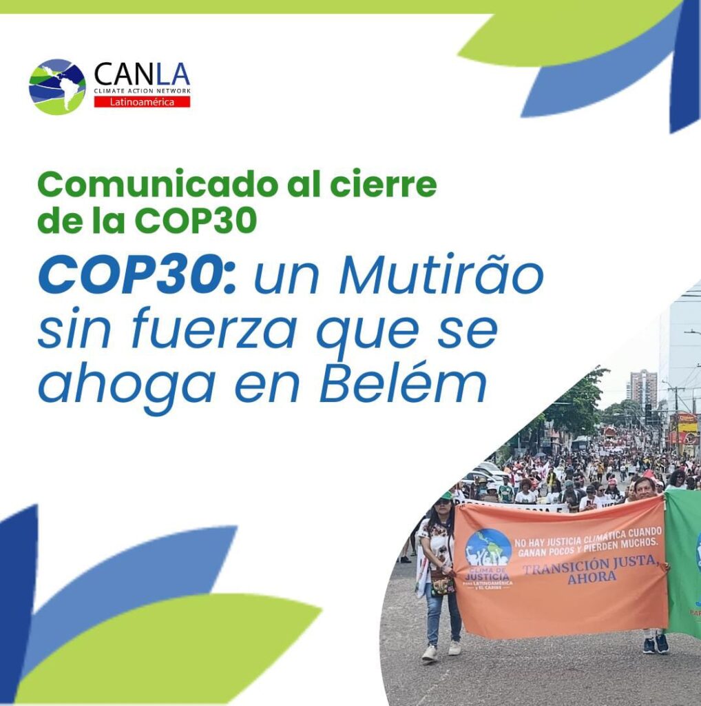 Belém, 22 de noviembre de 2025. La COP30 deja una sensación dulce al concluir con un importante avance en materia de transición justa, pero con deudas en los otros elementos de la negociación.  Para la sociedad civil de América Latina y el Caribe, articulada en Climate Action Network América Latina (CANLA), el proceso y el resultado final no dan las señales necesarias para fortalecer la confianza en el multilateralismo, ni están a la altura de la crisis.